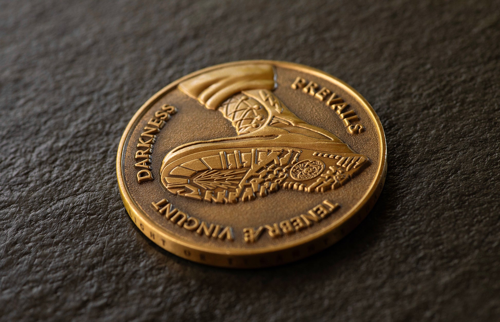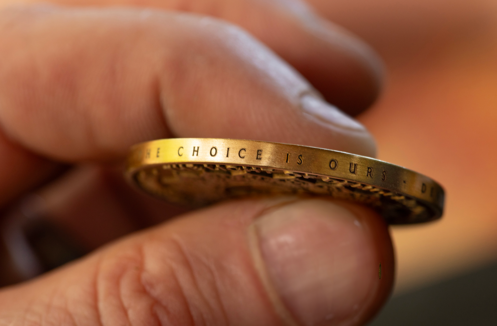 Antique Brass Coin by Shepard Fairey (decision-making technology). Limited edition 1.5" antique brass collector's coin from Shepard Fairey to help you choose between democracy and despotism!
