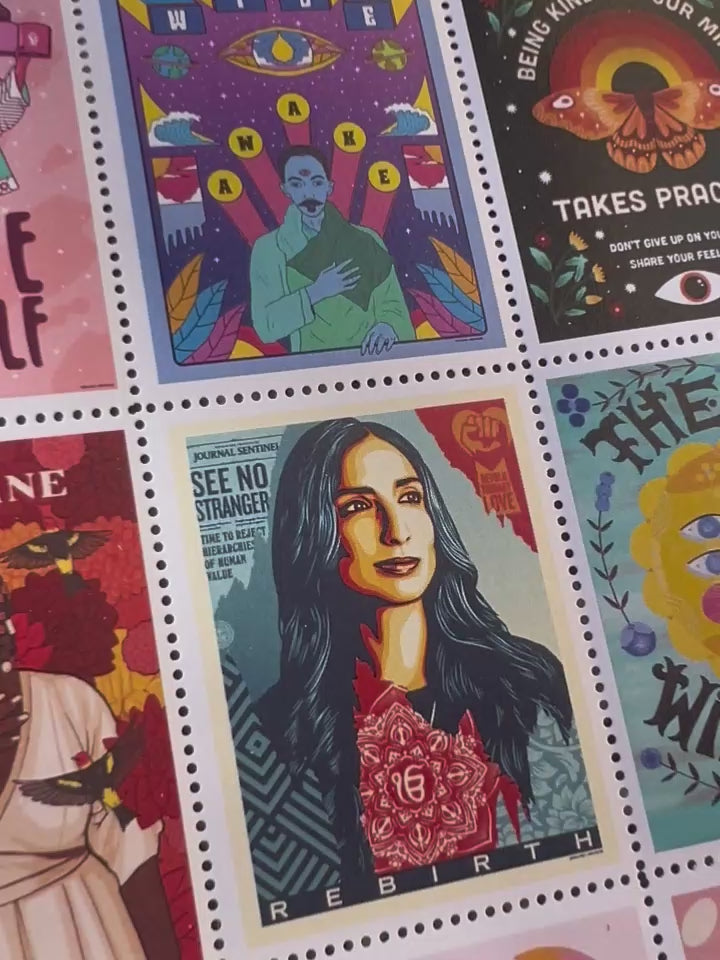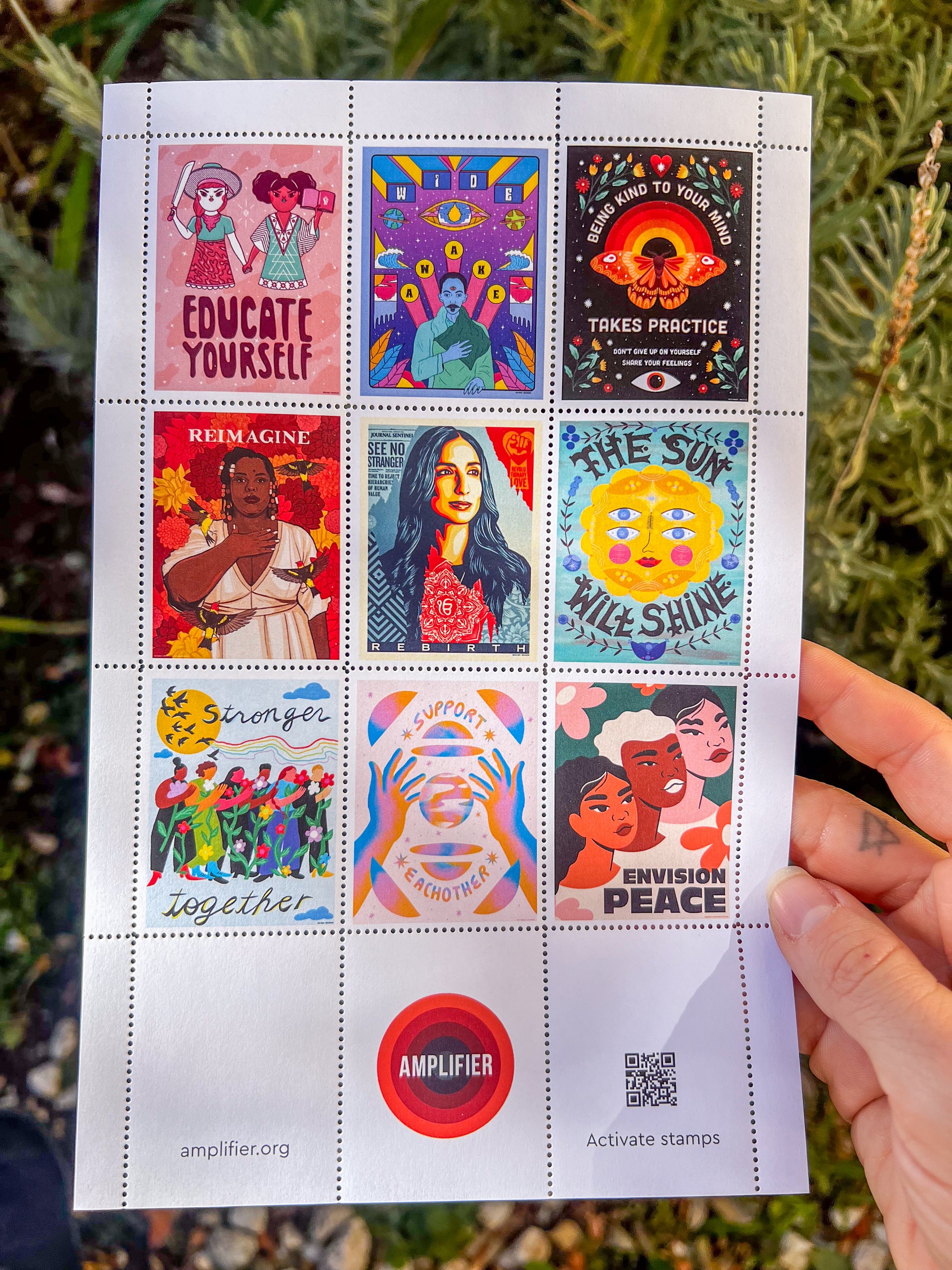 NEW limited edition 5.5 x 8.5” commemorative poster stamps made in collaboration with The Portland Stamp Company. This exclusive series showcases nine AR-activated artworks from various movements with messages of community, love, and hope by artists Bunnie Reiss, Camila Rosa, Creative Wannabe, Emily Perelman, Galih Putra, Nina Yagual, Noa Denmon, and Shepard Fairey,
