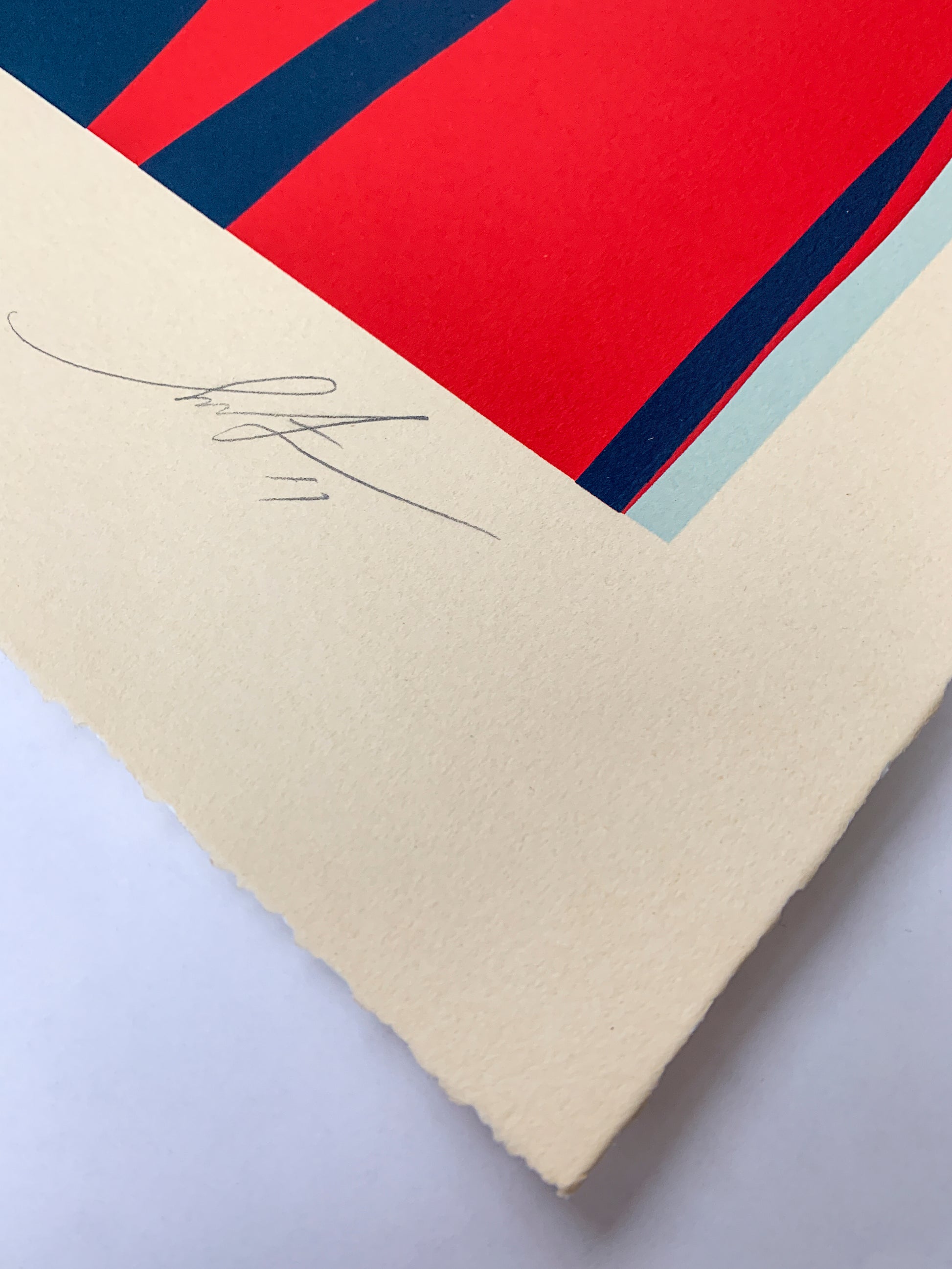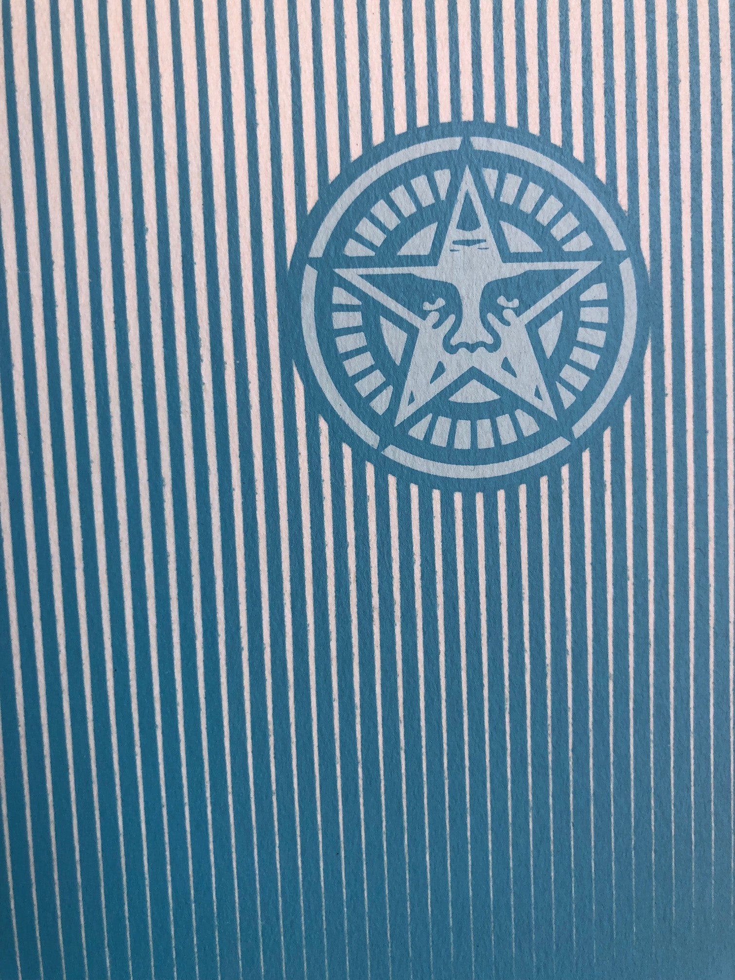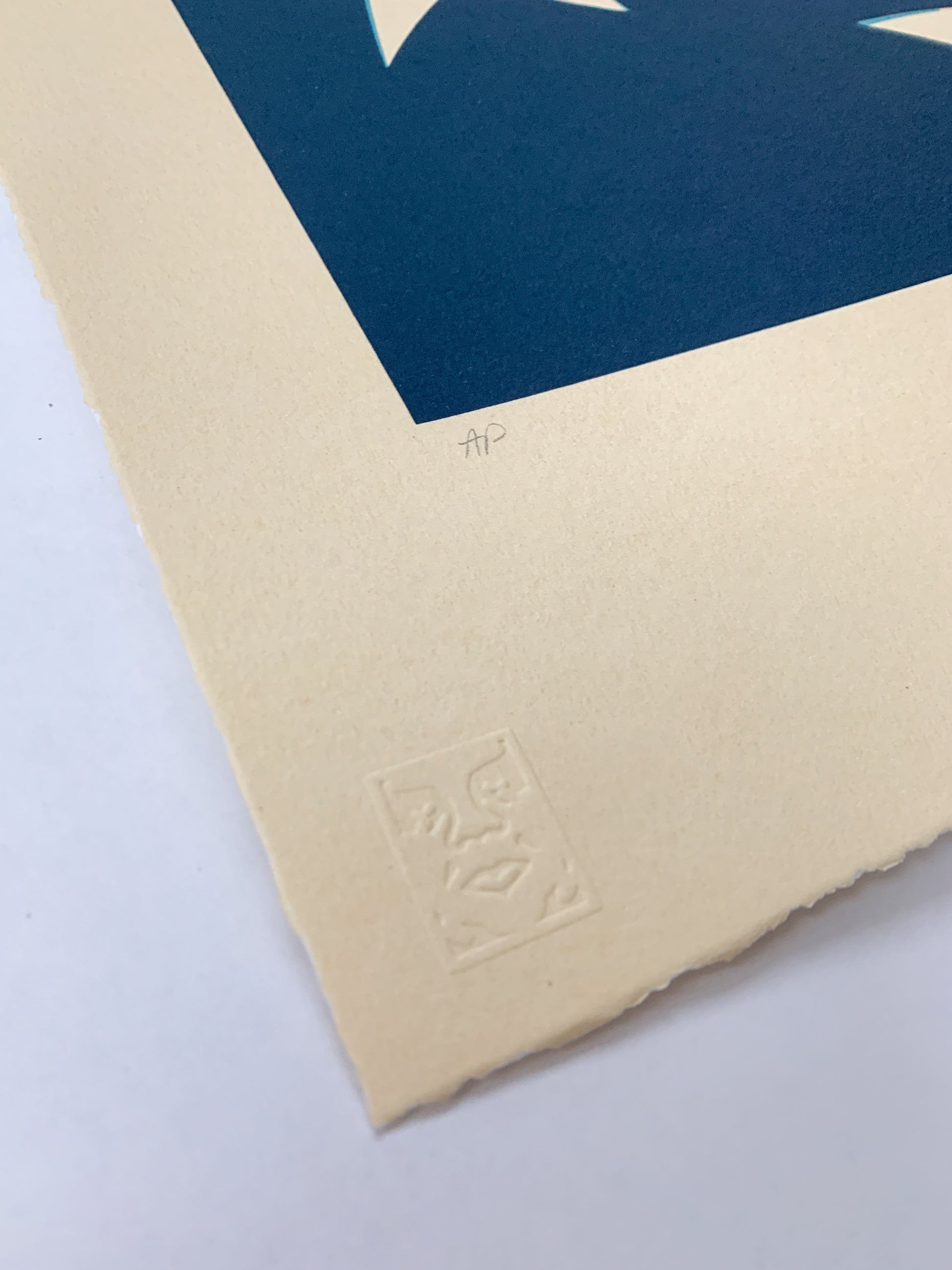 One of a kind! "Greater than Fear" fine art silkscreen 30"x41" SIGNED AP on thick creme speckle-tone paper by Shepard Fairey with hand deckled edges and an embossed chop in lower left.