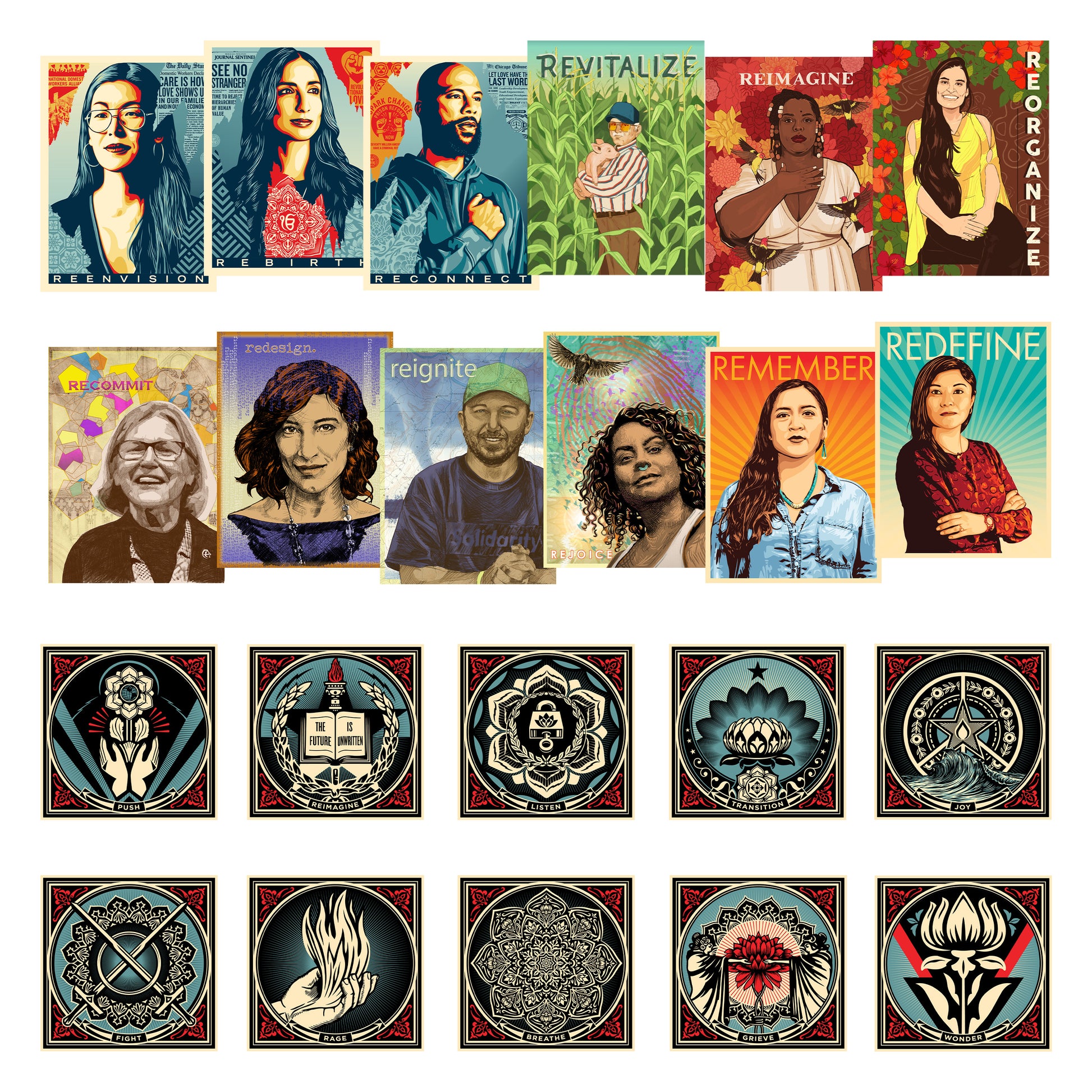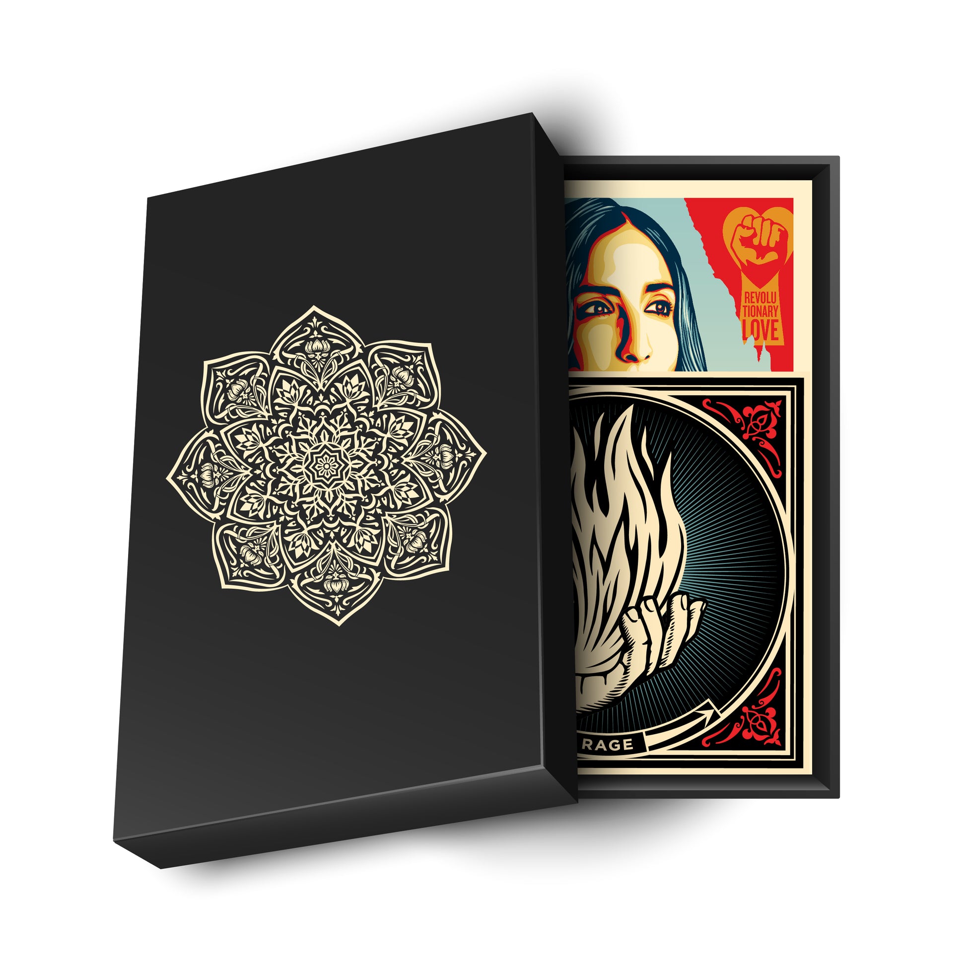 Twenty-two stickers and postcards in a custom foil embossed mini box featuring AR-activated postcards of all 12 REFRAME leaders by Shepard Fairey, Ernesto Yerena, Noa Denmon and LMNOPI plus all 10 silkscreen stickers from the Revolutionary Love series based on the teachings of the Revolutionary Love Project.