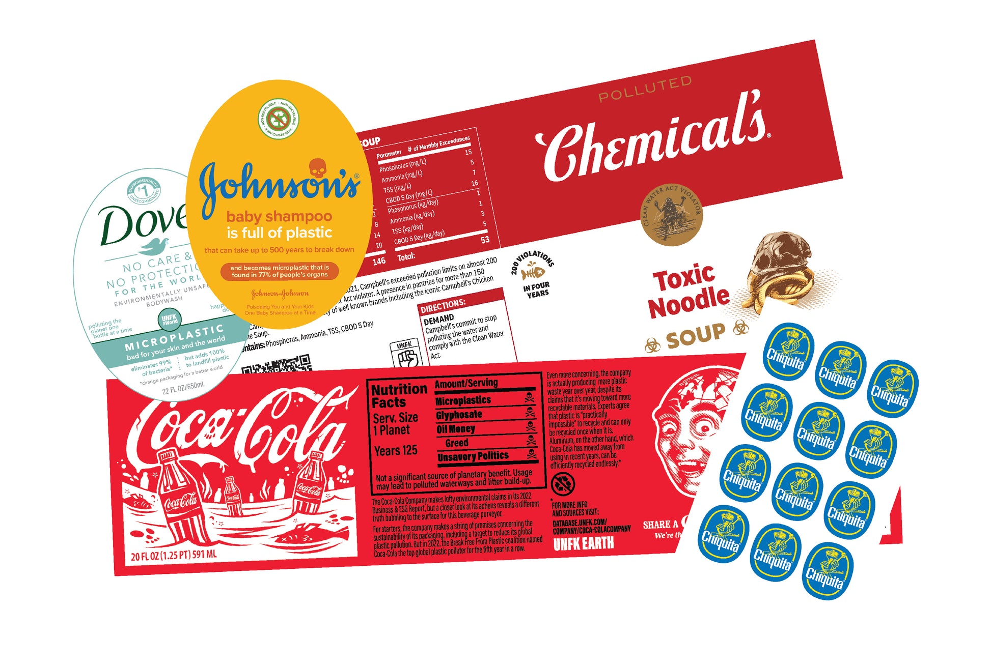 Help us spread these parody product packaging to advertise how these companies are accelerating climate change, polluting communities, and killing the soil!